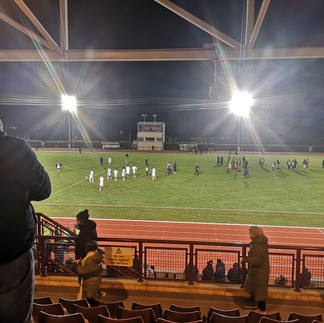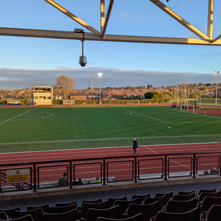 Once inside I'm straight up to the back row of the single seated stand at the venue. Less than 500 seats in total I'm told, elevated with the changing facilities beneath, it offers a great view despite their being an athletics track around the pitch perimeter.