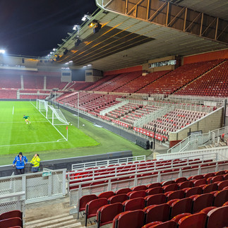 I've taken the A19 past Thirsk and onto the A66 ring road, it's all carriageway to the Riverside Stadium as I pass first the impressive Tees Newport Bridge all lit up in the dark, before being equally wowed by the nearby Transporter Bridge which is also glowing, purple neath the black sky.