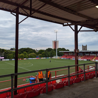 I have a quick pint of Hop House as I'm overseas and getting holiday vibes, just one, before finding my seat in the Main Stand, perched up on the back row, a tight squeeze near half way, the ground is lovely internally, three sides have seating, the opposite end open, those flats above the end to my right, where an idyllic church top also joins the horizon, that stand boasting the changing rooms and a glazed corner which I'm told today is being used for 'VIP'.